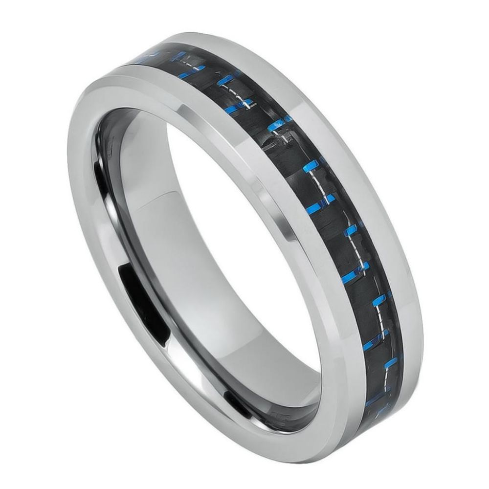 6mm Tungsten Carbide Black Blue Carbon Fiber Inlay Wedding Band Ring